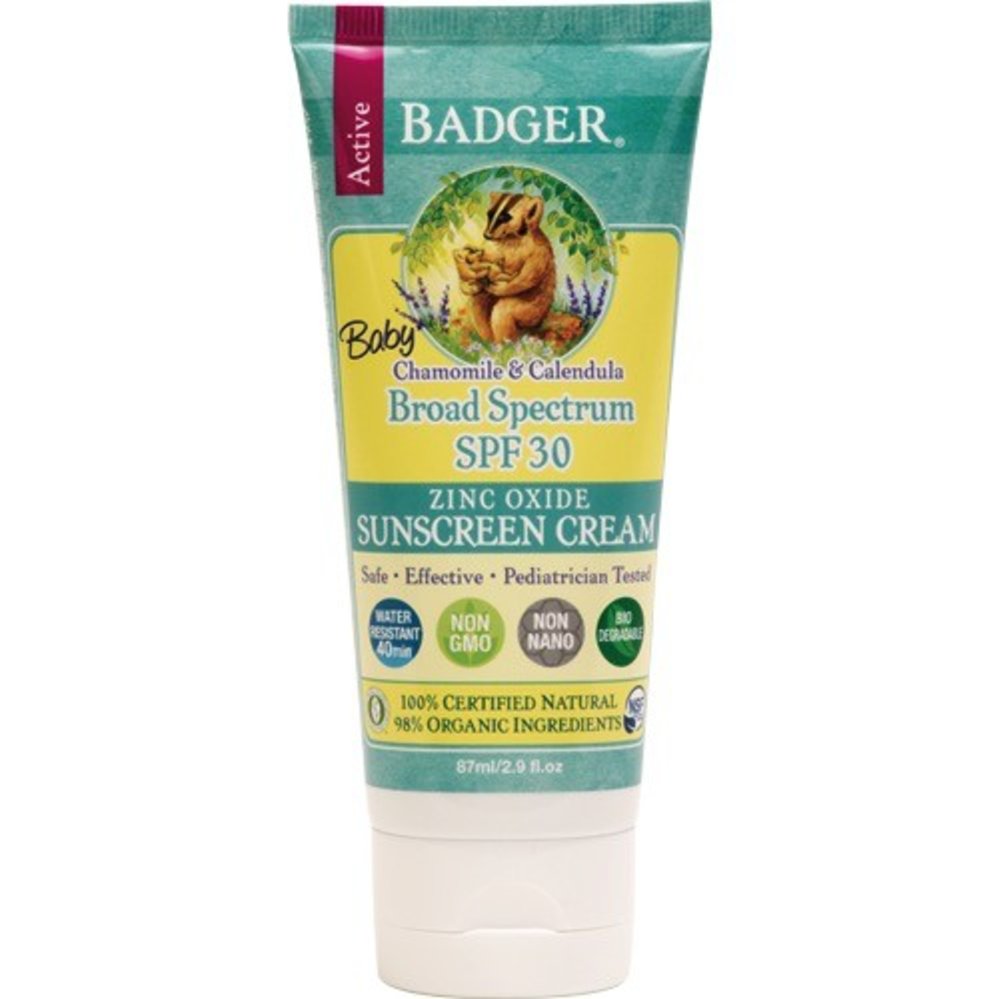 Safe, Effective, & Gentle Baby Sunscreen. Badger's SPF30 Baby Sunscreen Cream contains non-nano Zinc Oxide to protect from both UVA & UVB rays, in a base of safe, soothing USDA Certified Organic ingredients. It is water & sweat resistant for 40 minutes, biodegradable, and works immediately upon application. Badger sunscreens have been recommended by the Environmental Working Group, Consumer Reports, the TODAY show, SAFBaby.com and numerous other sources. Packaged in a BPA- and Phthalate-free, recyclable #2 plastic tube. This Baby Sunscreen Cream has the mild scent of Chamomile and Calendula, and can be used by the whole family! Pediatrician tested & approved safe for babies and kids.
