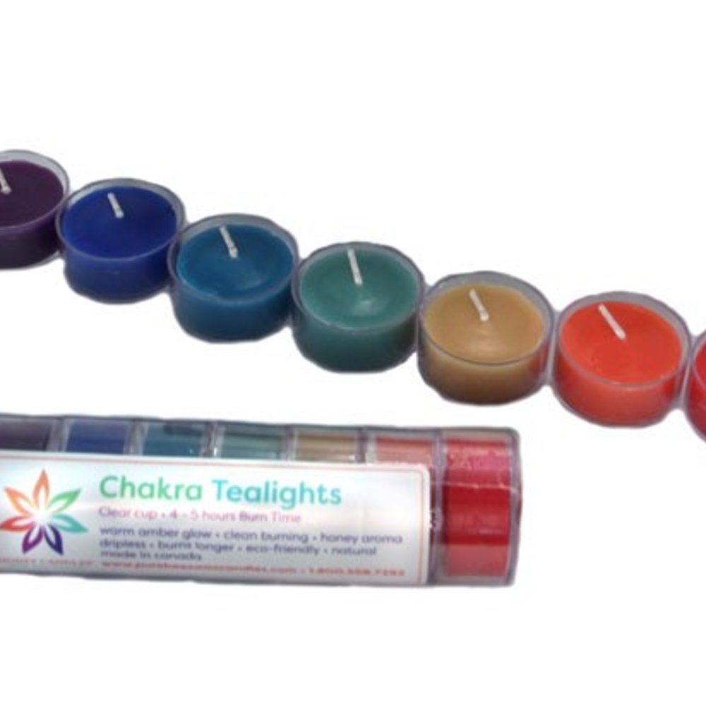 Enrich your yoga and meditation with this beautiful set of 100% pure beeswax tealights in the chakra colors: red, orange, yellow (natural beeswax), green, blue, indigo, violet plus one white tealight.