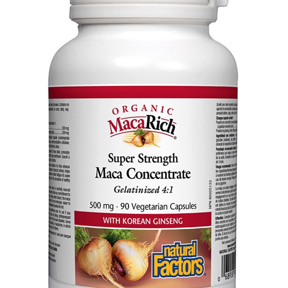 Natural Factors Organic MacaRich concentrate with Korean ginseng boosts energy, improves performance, and reduces physical and mental stress. It also supports immune health and improves hormonal balance and libido. MacaRich is hand-picked and sustainably grown. The 4:1 concentration is gelatinized to make it easier to digest and more bioavailable.