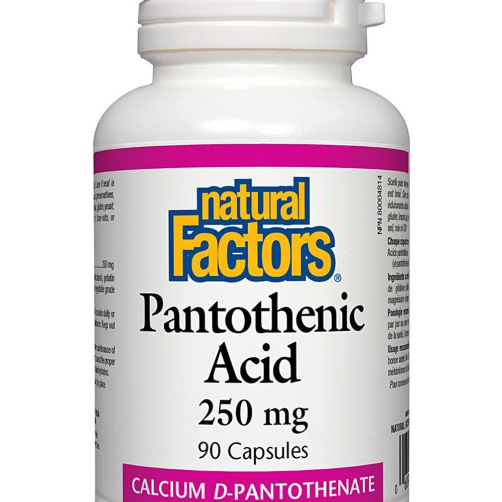 Natural Factors Pantothenic acid provides 250 mg of this very important B vitamin per capsule, for the maintenance of good health. 1–2 capsules daily will help to relieve effects from daily stress and help the body metabolize fats, proteins and carbohydrates into usable energy.