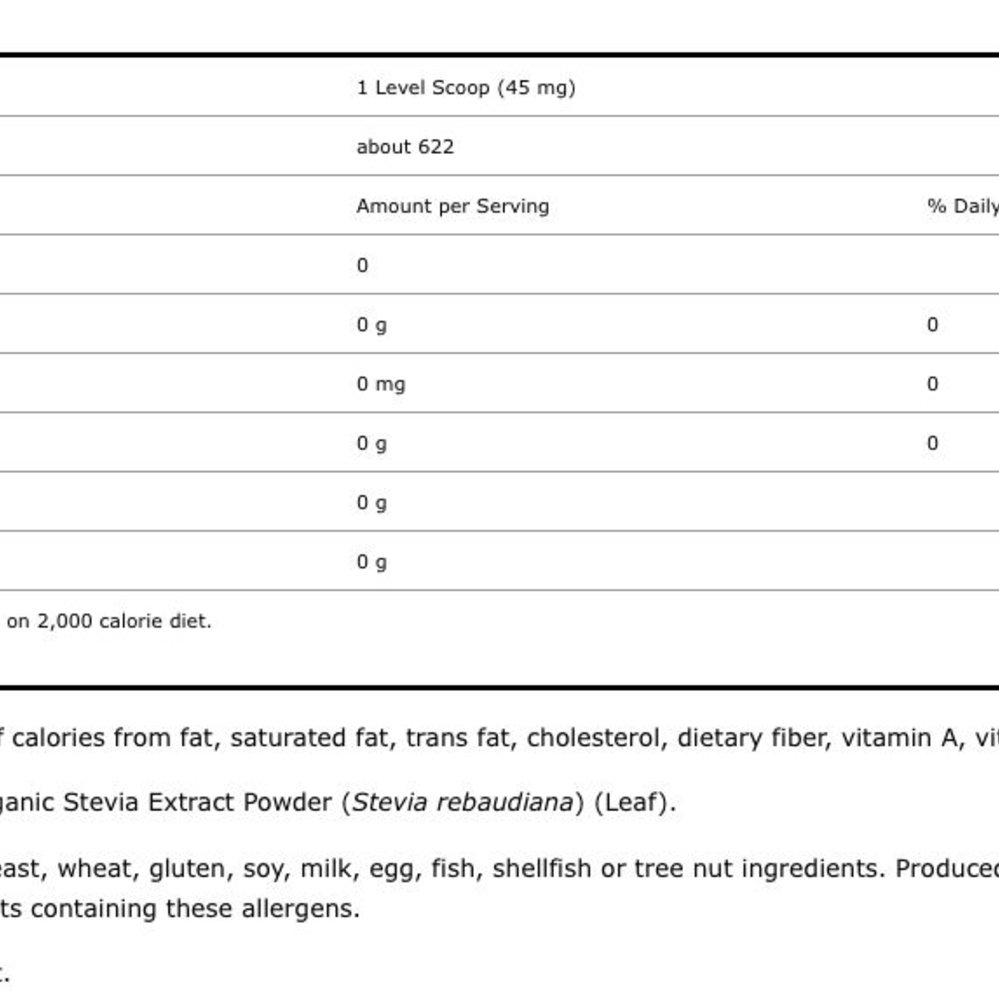Ingredients: Organic Steviol Glycosides (Stevia rebaudiana) (Leaf) Extract Powder.